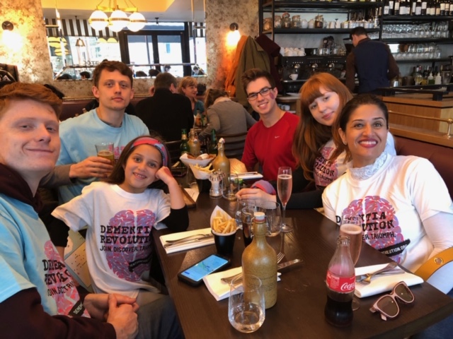 One of the strangest experiences of the race was about to hit me – and them. For some reason we all began to feel deeply emotional. Perhaps it was because Dad’s plan to run the London Marathon was actually HAPPENING? Perhaps I was really appreciating the support I had needed to get this far, as well as the fact that they were all there cheering me on? What ever the reason we all agreed afterwards that it was a powerful moment as I found them at the Cheer Point, waving their Dementia Revolution stuff, wearing Dementia Revolution T-shirts and tattoos and shouting like crazy! ”Go on Dad. So proud of you!” they yelled. As a father, life doesn’t get much better than the moment when your children tell you that they are proud that you are their Dad.
